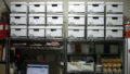 IKEAの収納棚をすべていおたグッズ置き場にしました。左上はトイレ用品・ウェットティッシュなどの消耗品、右上はお手入れ用品&首輪などの細々とした物、左下はクレート、右下は布物を置いています。右のゴミ箱は利用後のトイレシートを入れる為の蓋付きゴミ箱。