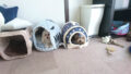 ミトをケージからわんこスペースに格上げしたところ、毎朝かなり散らかっている状態になりました。いおたは私たちがおやすみと伝えて寝室に上がったらわりとゆっくりすごしていたみたいなのですが、ミトはどうもそのあともおもちゃで遊び続けるみたいで、朝起きるとぐっちゃぐちゃ。