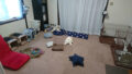 部屋が散らかっているのは相変わらずですが、ミトは今まで絨毯の上でぼてっと寝そべっていることが多かったので朝一、家の中に入っているのを見かけたのが初めてだったんです。